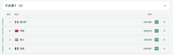 米兰冬奥会短道速滑“混合团体接力项目”半决赛第一组赛果。(米兰冬奥会提供)
