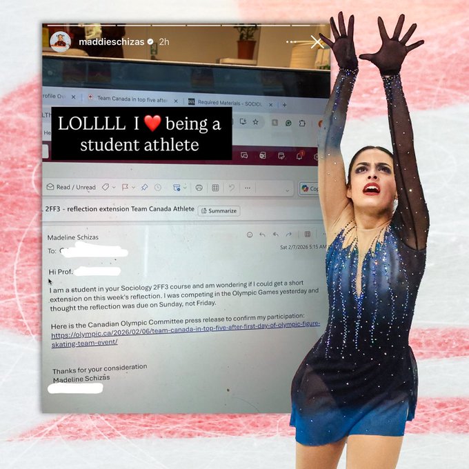 据报道,斯基萨斯在比赛结束后的上周六凌晨,给负责这门课的萨茨维奇教授写了一封邮件,询问“能否将本周的反思报告作业延期提交”。她表示:“我昨天参加了冬奥会,以为作业的截止日期是周日,而不是周五。”邮件中斯基萨斯还附上了加拿大奥委会确认她参赛的新闻稿链接。随后,斯基萨斯将邮件截图发在了社交媒体上,迅速引起各国网友关注。