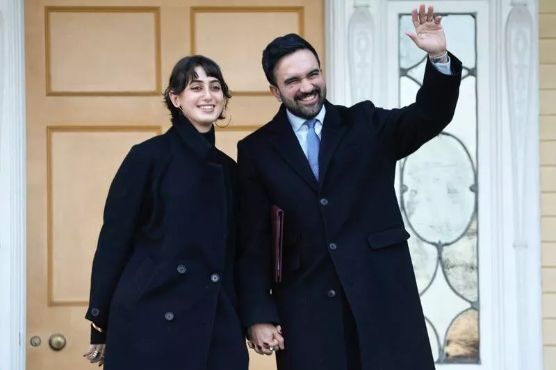2026年1月12日,美国纽约市长曼达尼与妻子拉玛‧杜瓦吉在正式搬入市长官邸的记者会上,向媒体挥手致意。(彭博社)