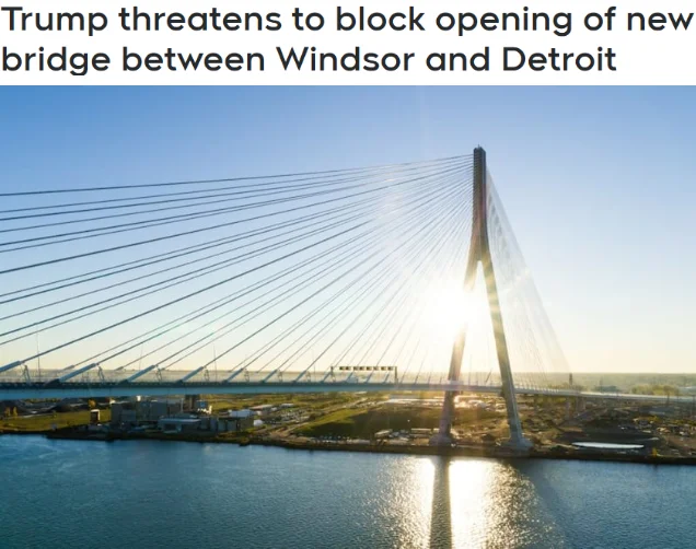 美国总统唐纳德·特朗普表示,如果美国没有“得到充分补偿,拿回美国给过加拿大的一切”,他将“不会允许”连接安省温莎和密歇根州底特律的新跨境大桥投入使用。