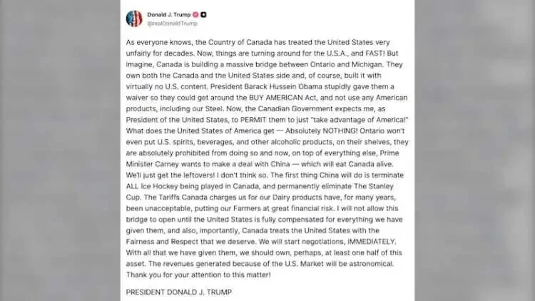 特朗普声称,加拿大一直在占美国的便宜。他表示,由于“美国市场带来的收入将是天文数字”,美国“至少应该拥有这座大桥的一半产权”。