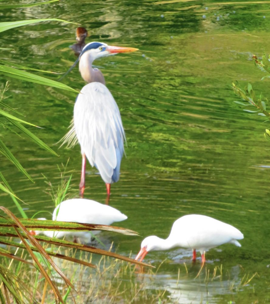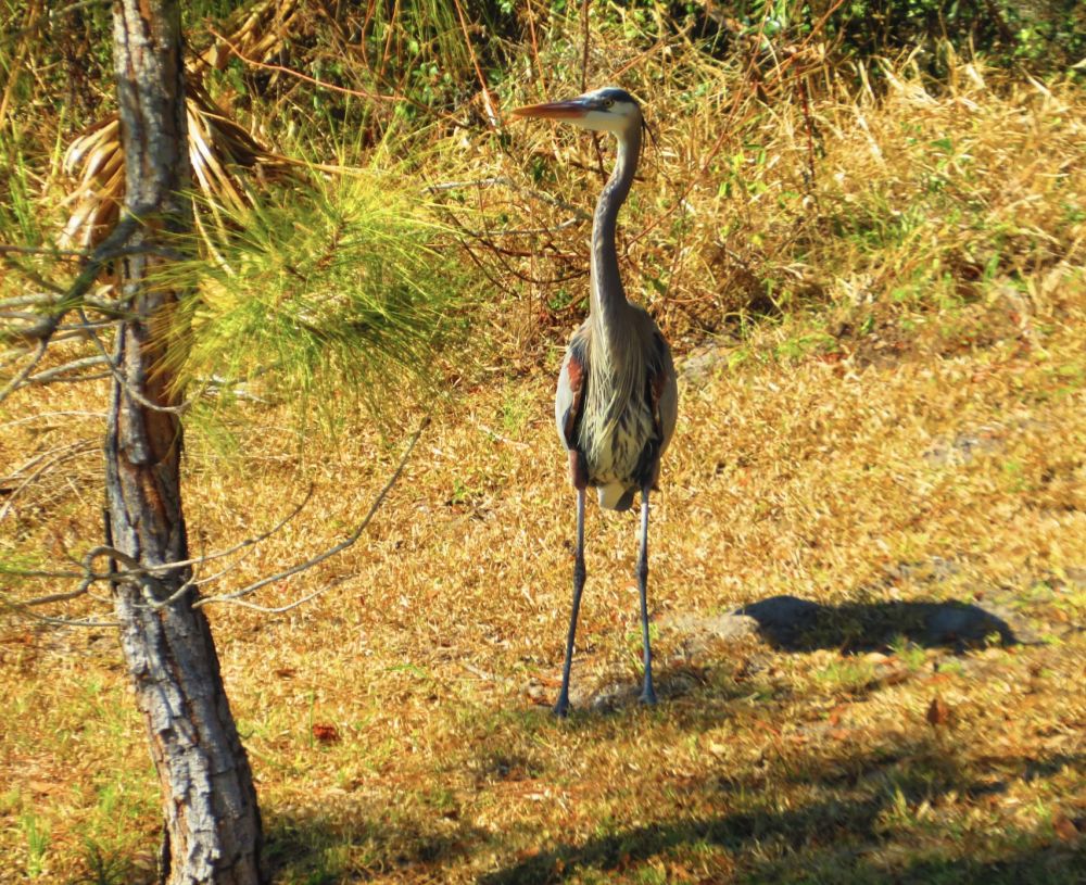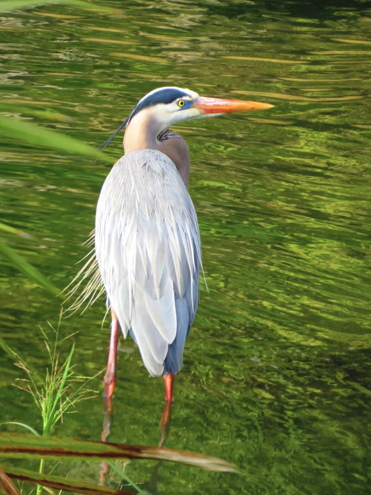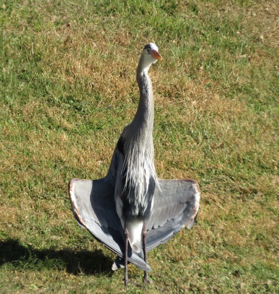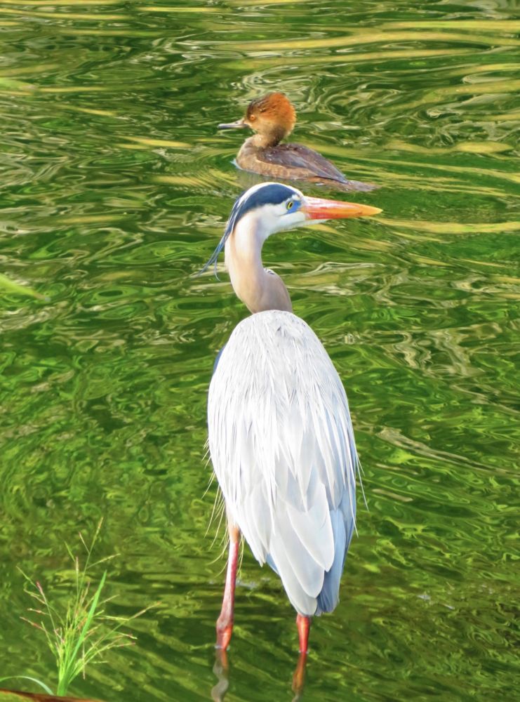 居住小区的水塘虽小, 鸟儿还挺多。观看它们给我们每天的散步带来了不少乐趣。在此分享我们最近与一Big Blue Heron大蓝鹭的几次有趣偶遇。