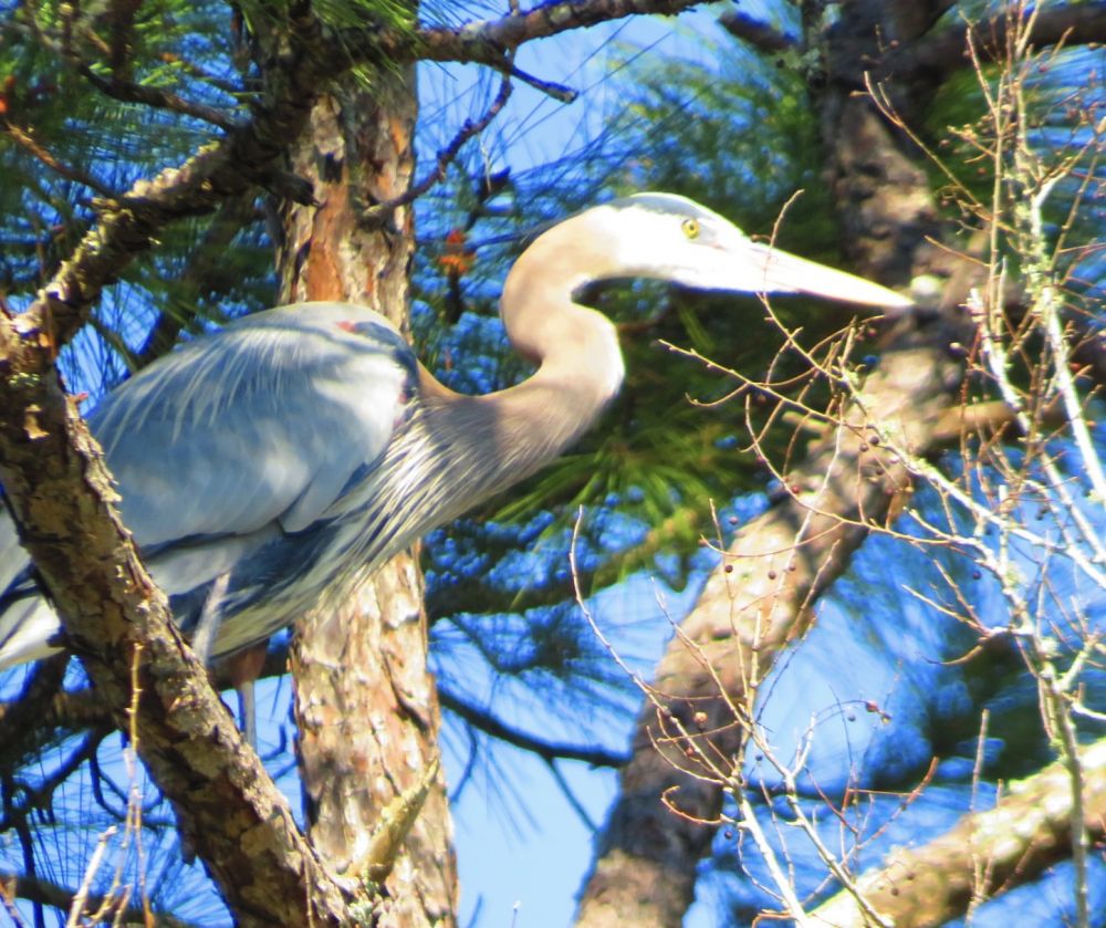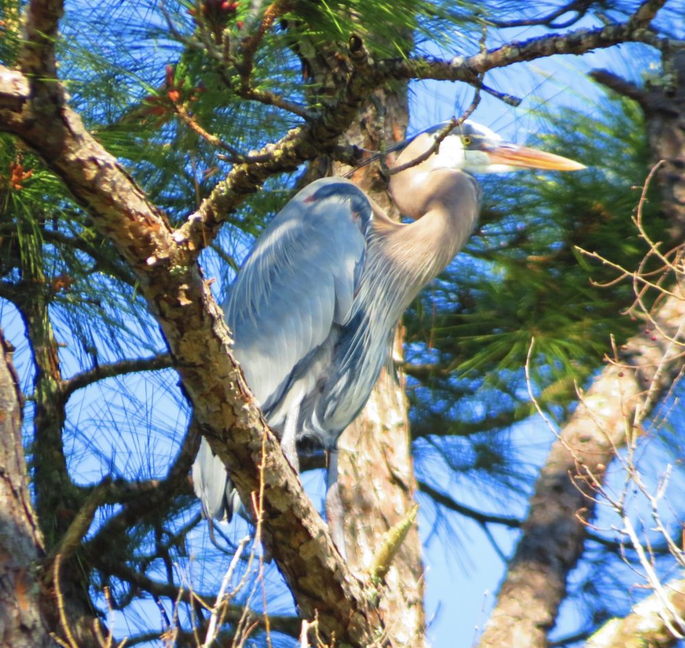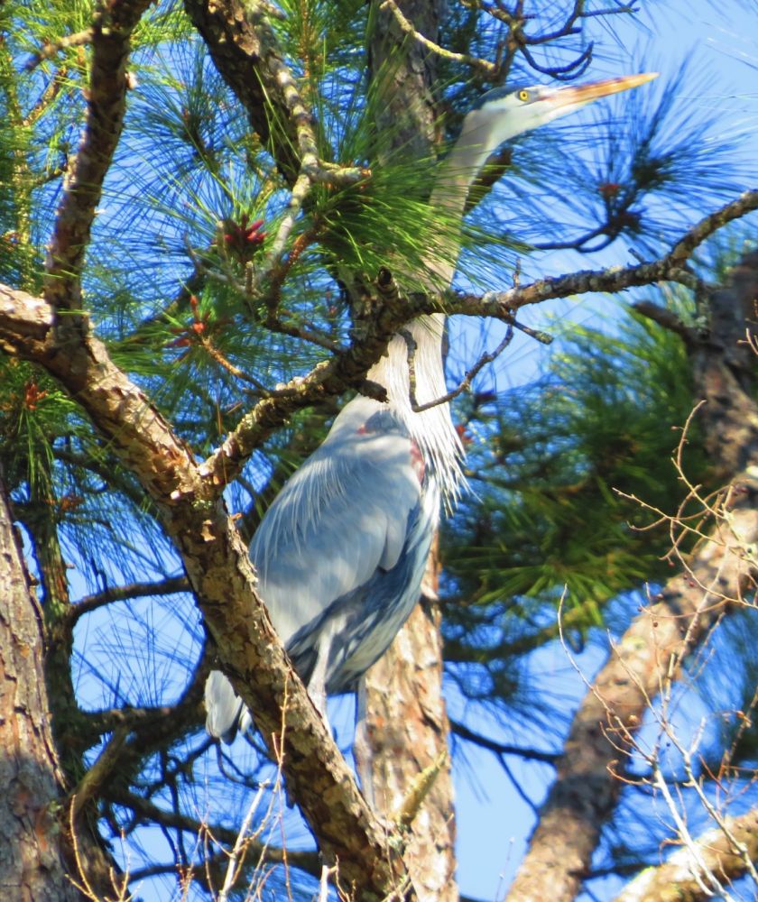 前几天,远远望见这只大蓝鹭停在对岸高高的松树上。又感好奇, 它为什么在那里?干啥?