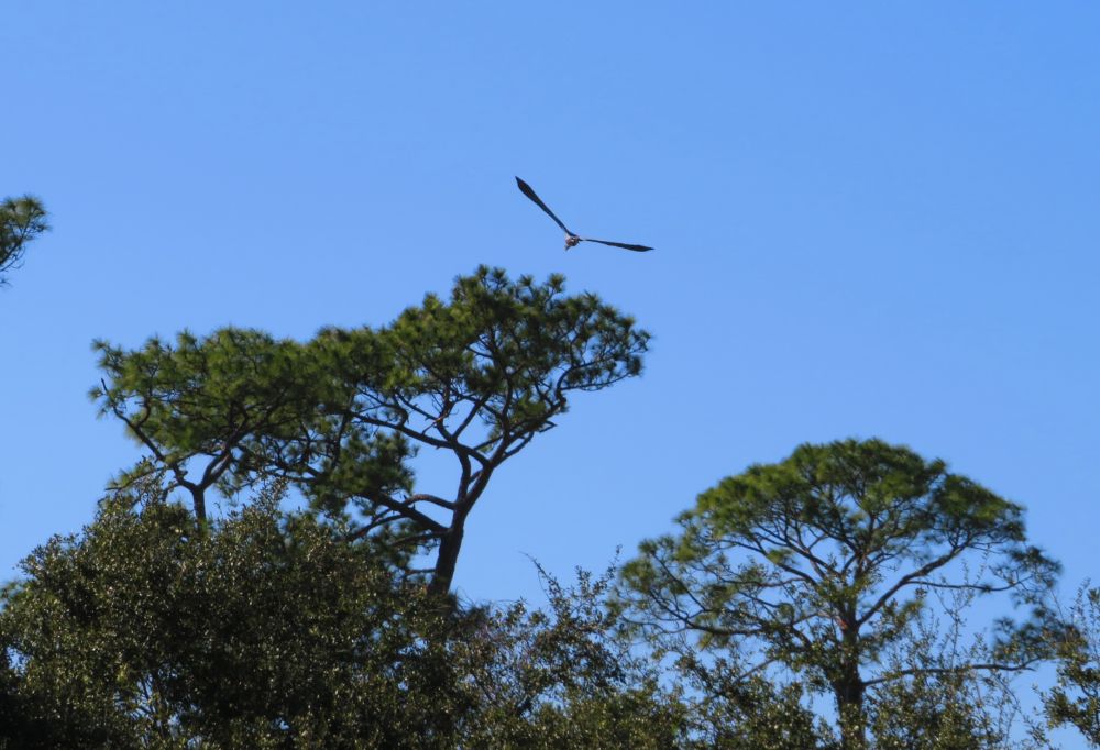 忽然,它起飞了。正遗憾时, 却见它飞了回来, 降落在塘边那株松树上。