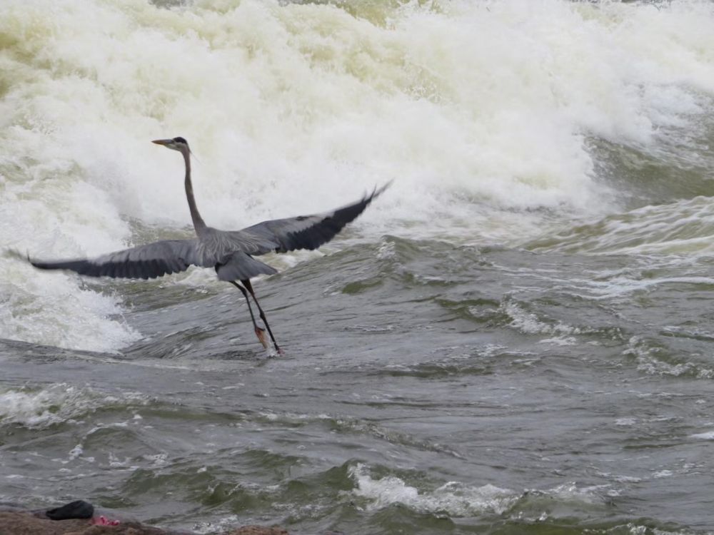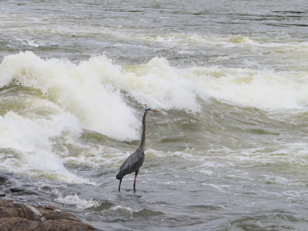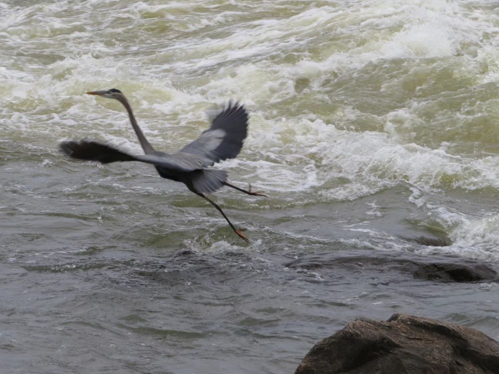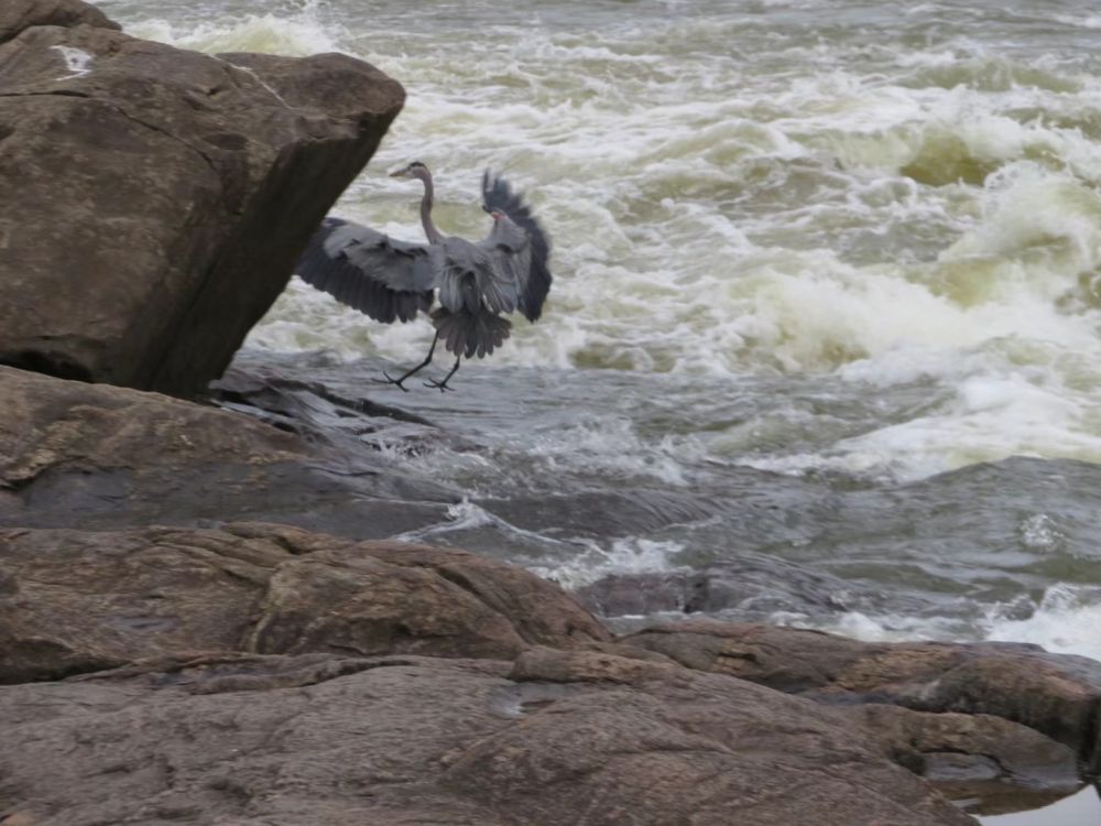写到此时, 两年前在乔治亚州的Columbus 附近与阿那巴马交界的河流(Chattahoochee River)上见到的一幕大蓝鹭涌上脑海, 找出照片。看吧, 两只大蓝鹭在激流河水中,如似海燕勇敢地冲向激浪寻食! 那时那景深深地震撼了我, 原来以前心目中平和善良的大蓝鹭可以这样奋勇向前!