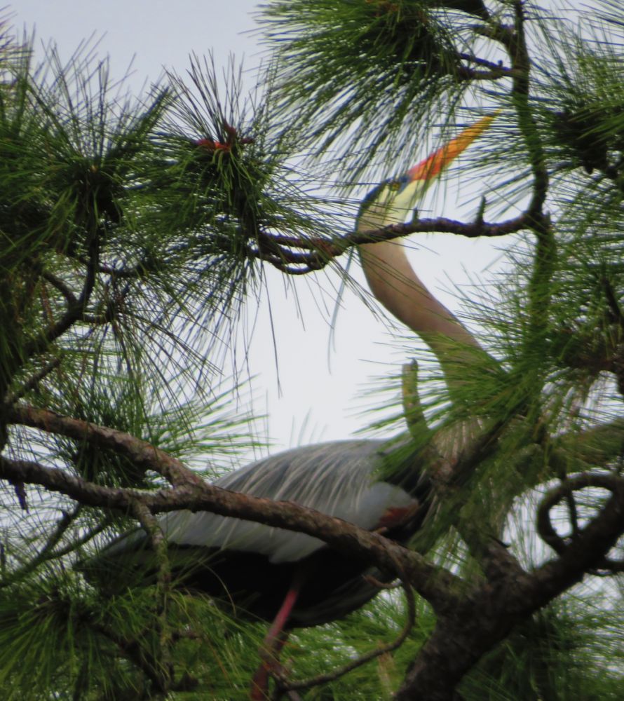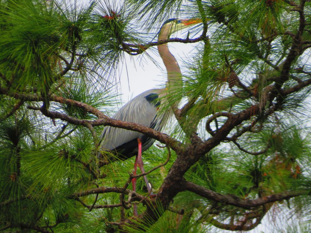 以往见到的大蓝鹭,多在水边或矮树上筑巢或喂雏。于是赶快拿相机对焦距。呀, 只见它身姿修长,颈项柔曲,与松枝相映,一幅幅鸟-松画境。说时迟那时快地抢了几张。