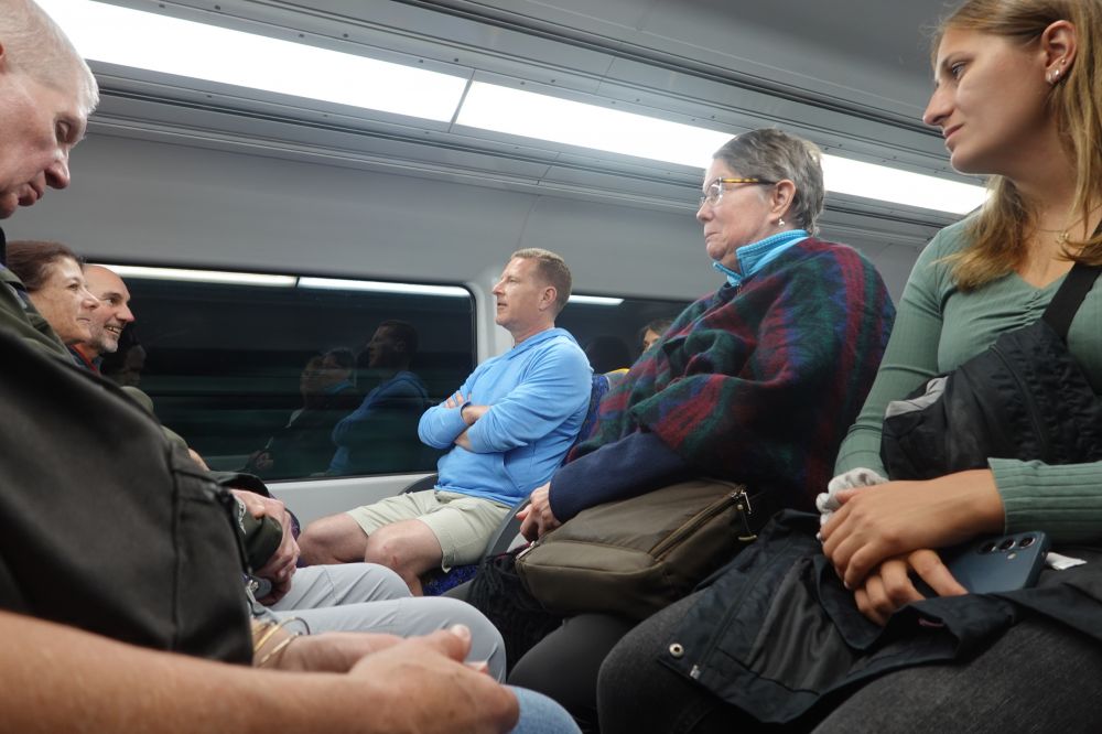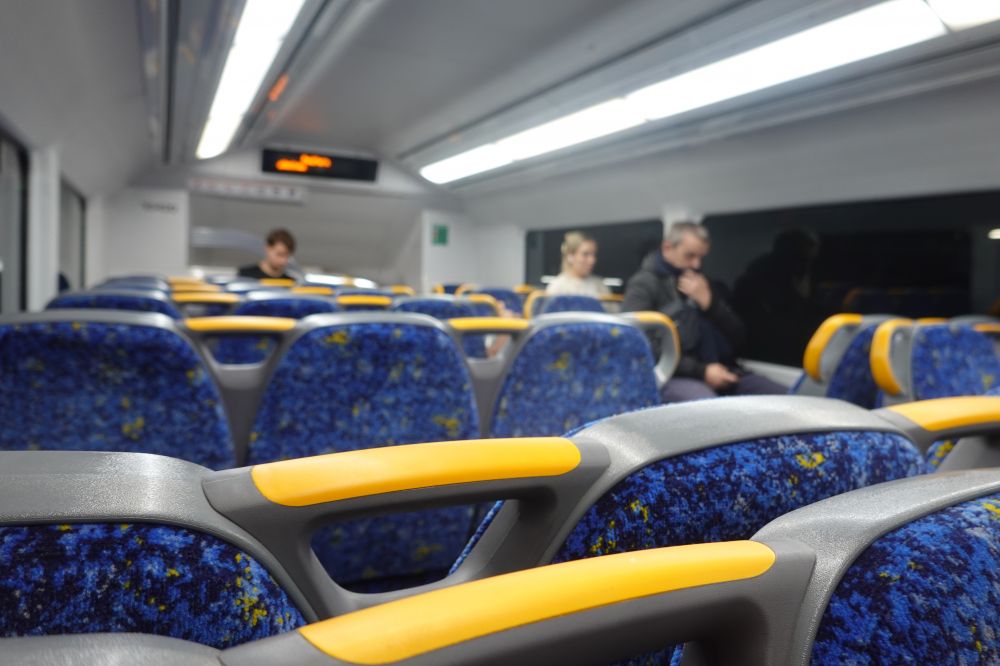 这种火车有一个小设计很有意思:座椅可以根据个人意愿调整朝向,只需轻轻抬起黄色拉杆,往后一绕,座椅就能从正坐变成逆坐。简单、实用,让人忍不住佩服设计者的巧思。