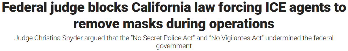周一,洛杉矶一名联邦法官阻止了加州执行一项法律,该法律原本要求移民与海关执法局(ICE)探员在移民执法行动中摘下面罩。