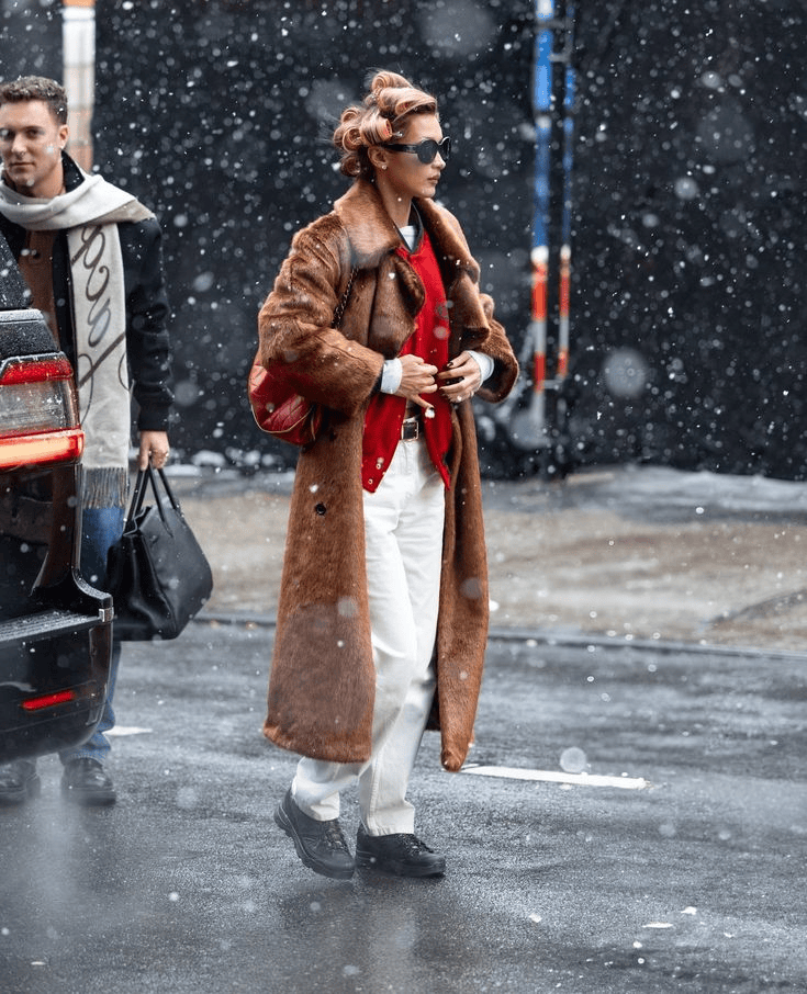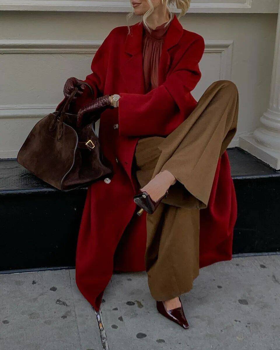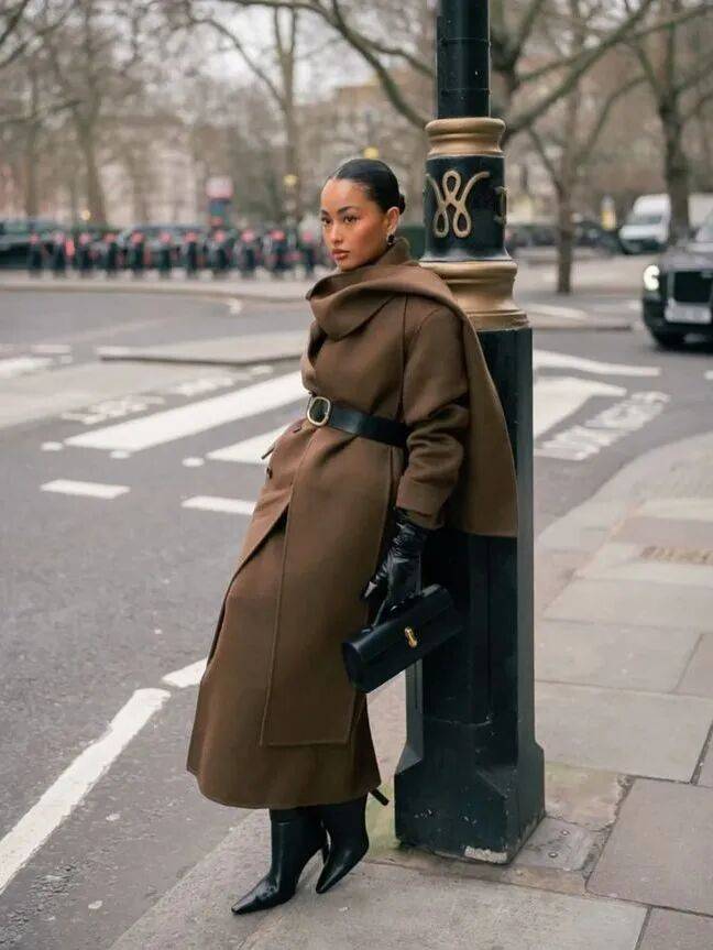 她可能选择一件剪裁优良的勃艮第红大衣,搭配棕色针织衫和米色长裤,营造出温馨的氛围。