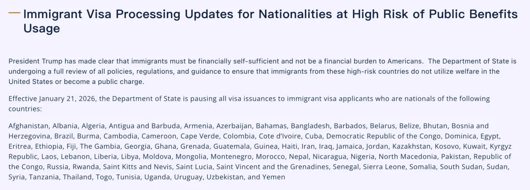 自2026年1月21日起,美国国务院暂停向包括中国在内、其移民群体被认定为较高比例依赖美国公共福利、损害美国纳税人利益的国家国民签发移民签证。