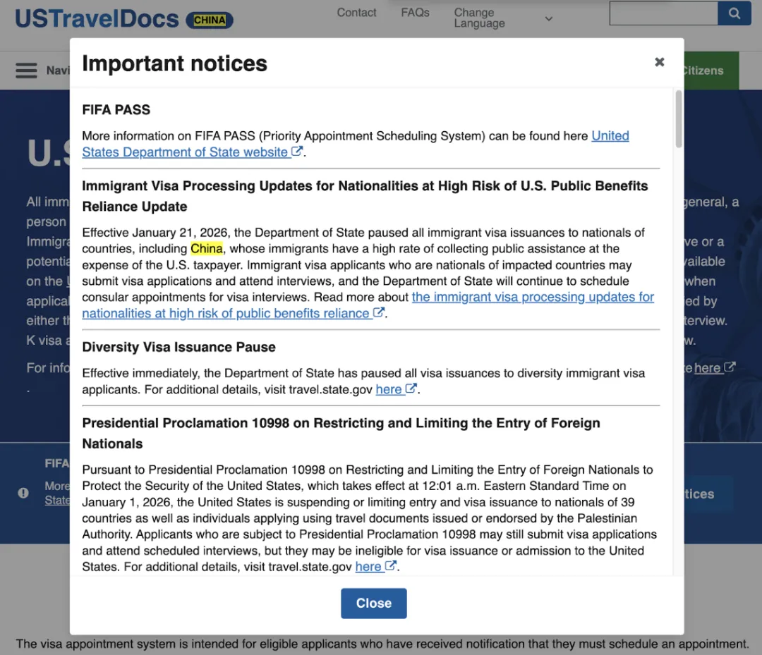 根据目前受理状况看,目前现象很可能是由于USTravelDocs官网系统错误、自动弹窗内容误导、或政府承包商工作失误造成的,而非国务院的正式政策文本。