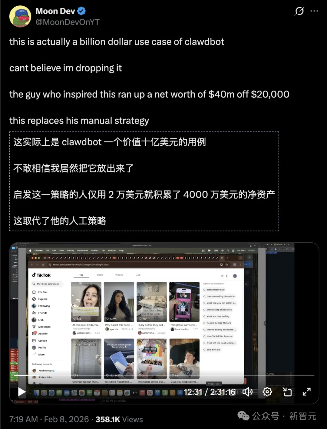 就在视频开始爆发的5分钟前,他的OpenClaw已经完成了识别:抓取内容 → 判断情绪强度 → 交叉验证 → 匹配可交易标的 → 建仓。