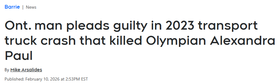 一名来自安大略省安格斯(Angus)的男子,因在2023年8月一起交通事故中涉嫌危险驾驶致人死亡及造成身体伤害,并导致奥运花样滑冰选手亚历山德拉·保罗(Alexandra Paul)身亡,已在开庭审理前认罪。