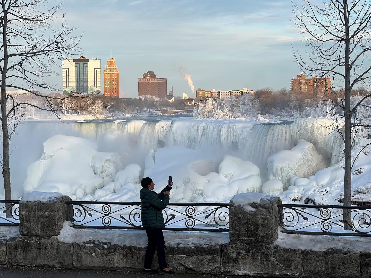 尽管气温低于零下,游客们仍前往尼亚加拉大瀑布,欣赏壮观的冰层堆积。