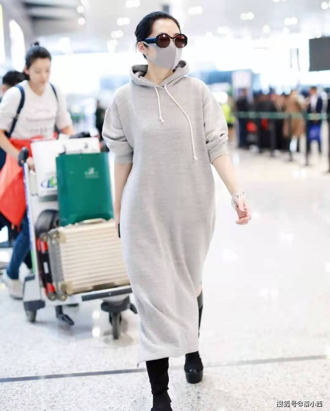 身上这件长款卫衣具有连衣裙的特点,整体版型宽松,藏肉的同时让人有自在感。长度基本到脚踝处,慵懒感直接拉满。脚上是黑色靴子,无形间拉长了腿部线条。墨镜与口罩的存在不仅可以隐藏面部肌肤,也让整体穿搭多了几分低调的时髦感。