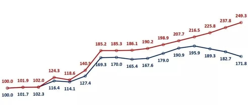 公众号「数据GO」根据国统局每月公布的70个大中城市房价进行测算,以2010年底价格为100,测算出历年年底对应城市的二手房和新房的价格,并绘制成趋势图。