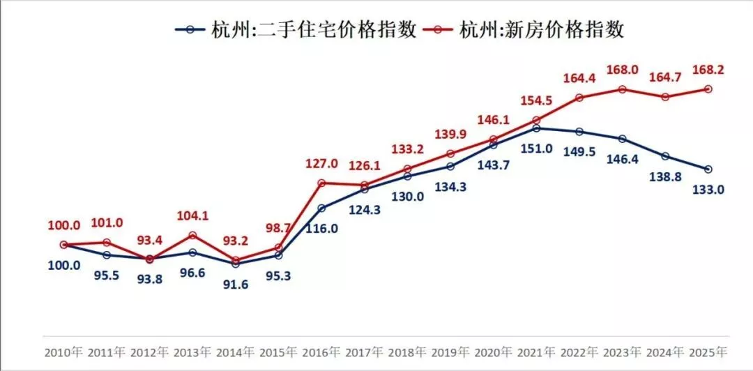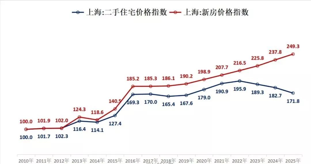 但在此后,两市新房指数继续向上,其中上海一路涨势如虹,杭州在2024年微跌之后,2025年重拾涨势,但指数比2023年微高。