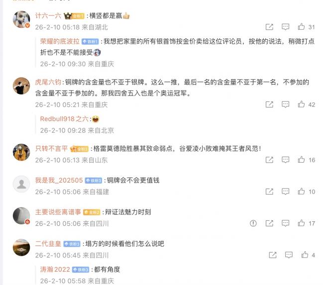 网友称,“我想把家里的所有银首饰按金价卖给这位评论员,按他的说法,稍微打点折也不是不能接受”“这么一说我拿银条换金条是不是也符合逻辑”“银牌的含银量绝对比金牌高”“拿着纳税人的钱自嗨挺好的”。