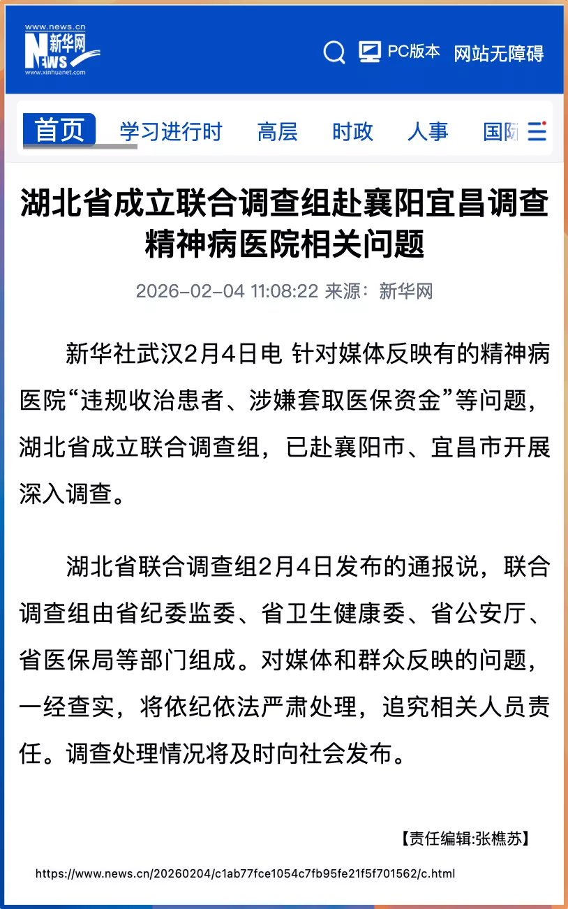 2月4日,湖北省层面再升级:由省纪委监委、省卫健委、省公安厅、省医保局等组成联合调查组,赴襄阳、宜昌深入调查,并明确“查实将依纪依法严肃处理、追责”。