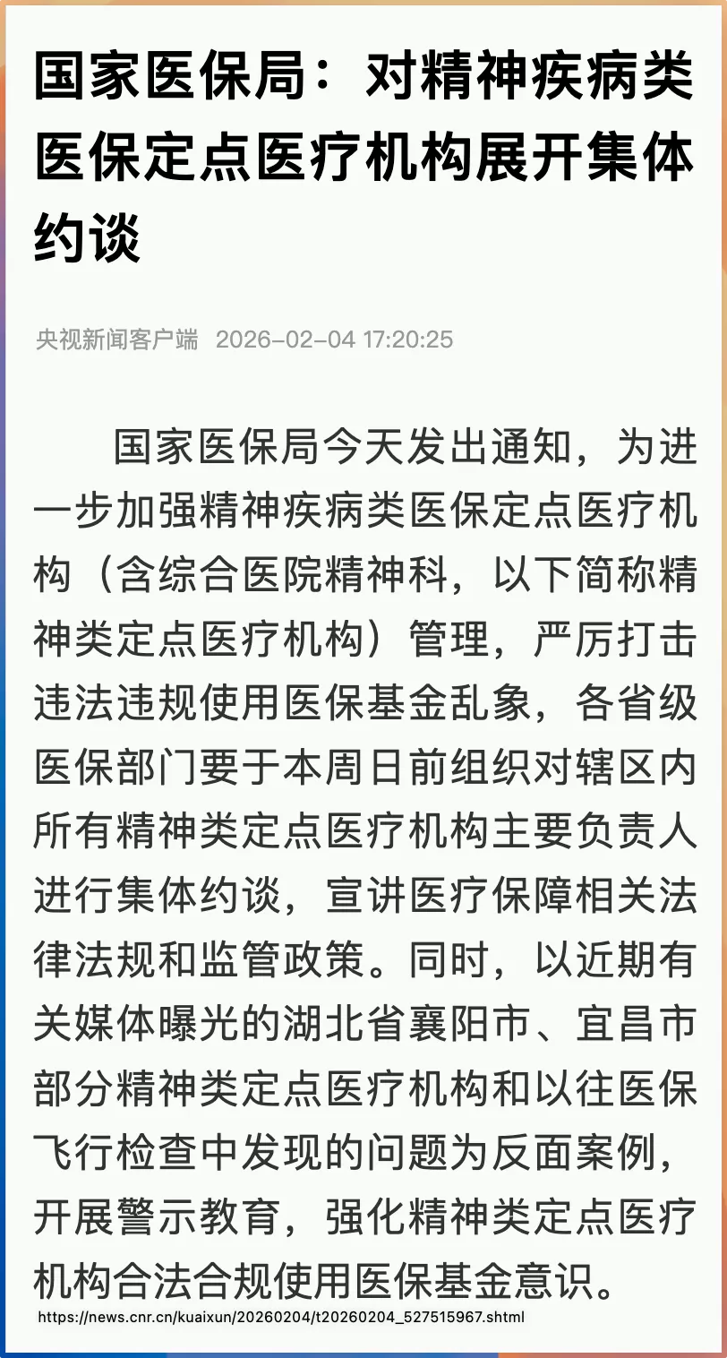 这次舆情发酵后,国家医保局层面也迅速出手,要求对精神疾病类医保定点医疗机构开展集体约谈、限期自查自纠,并把精神类定点机构列为专项飞行检查重点,明确“情节严重移送公安”。