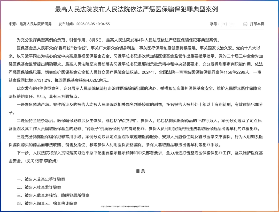 最高人民法院发布“依法严惩医保骗保犯罪”典型案例,明确以虚构事实骗取国家医保基金,依法以诈骗罪追责的裁判导向。