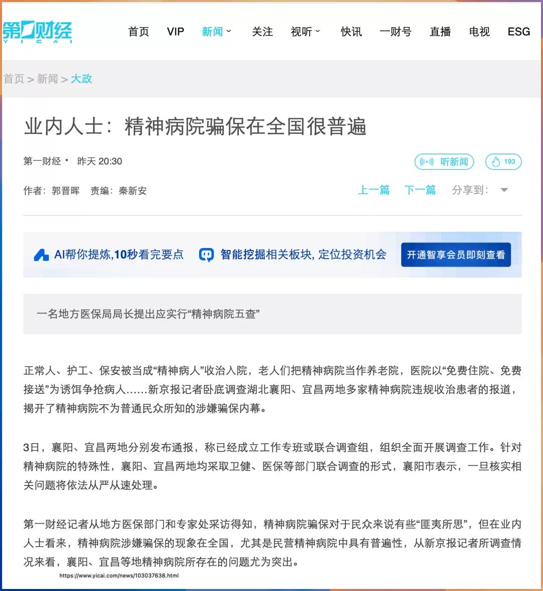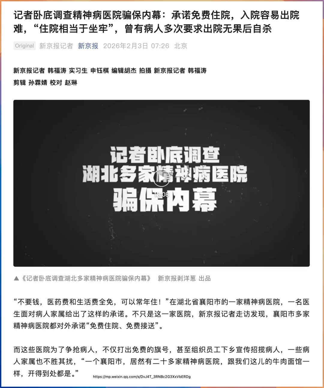 2月3日,新京报发布卧底调查,指向湖北襄阳、宜昌多家精神病医院存在“承诺免费住院、虚构病情收治、阻挠出院、疑似套取医保基金”等问题。