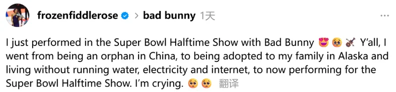 配文写道:“我刚刚和Bad Bunny一起登上了超级碗中场秀。朋友们,我是来自中国的孤儿,被阿拉斯加家庭收养,在没有自来水、电力和互联网的环境中生活,一路走来,如今站上超级碗中场秀的舞台。我哭了。”