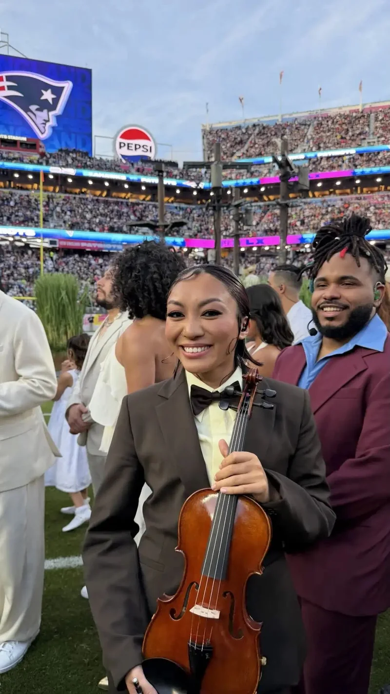 她在社交媒体Threads上分享了一张演出结束后不久身着舞台服装、手持小提琴站在球场上的照片。