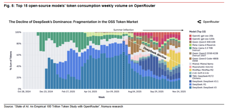 在2024年底,DeepSeek的两个模型曾占据OpenRouter上开源模型Token使用量的一半以上。但到了2025年下半年,随着更多玩家加入,其市场份额已显著下降。