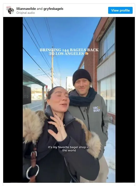 她把多伦多的这家店称为自己的“全世界最爱的贝果店”,并与自己的音乐人丈夫 Sean Kolar 一起记录了这趟“贝果搬运行动”的全过程,视频发布在她的 Instagram 账号上,瞬间火爆。
