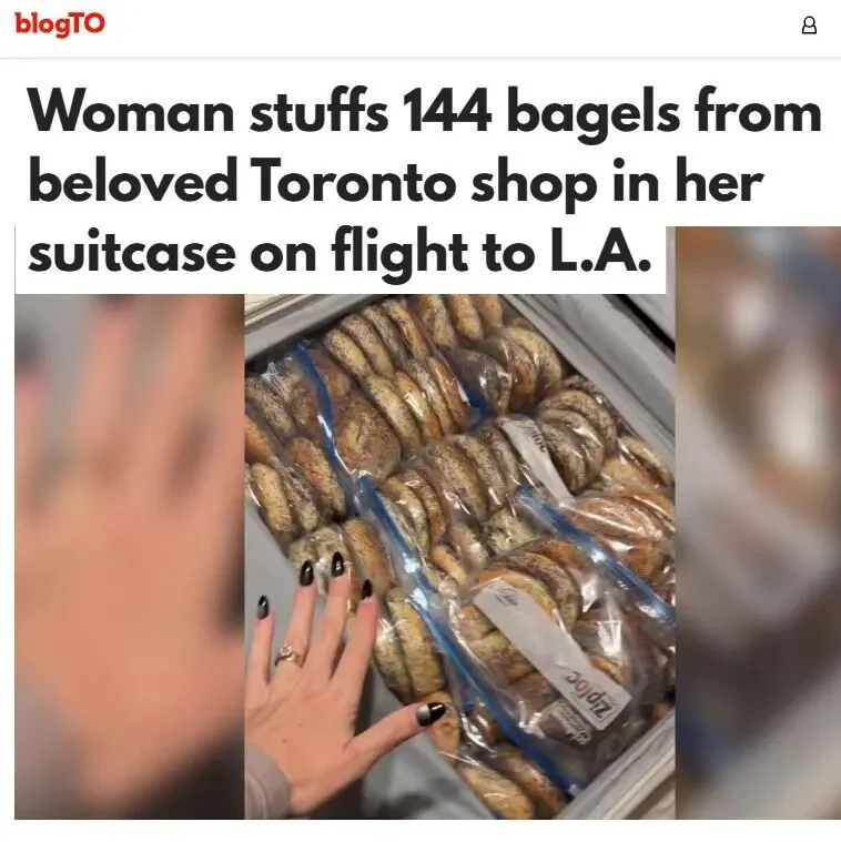 如果你要坐飞机从多伦多回洛杉矶,行李箱里会装什么?一位女士的答案可能是:144个贝果(bagel)!