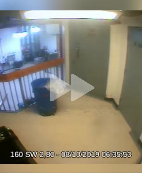 当地时间2019年8月10日6时30分左右,从监控录像中可见一名狱警走向爱泼斯坦牢房所在隔离楼层旁的值守台。 图源:《每日电讯报》视频截图