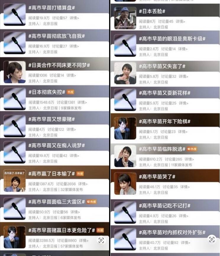 在高市胜选后,《北京日报》又发布“高市早苗人设崩塌”、“高市赢了日本输了”、“高市早苗赌赢日本更危险了”、“日本彻底失控”等新闻。旅意华裔作家李颖在X “李老师不是你老师”帐号上发布相关新闻全部截图,并讽刺:“北京日报已急哭”。