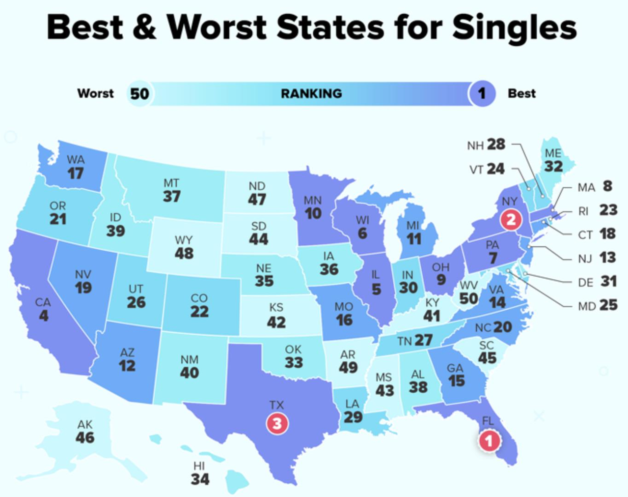 至于全美最不适合单身人士居住的州,WalletHub指出为西维吉尼亚州。该州在「约会经济」排名第35名、「浪漫与娱乐」排名第45名,而在「交友机会」方面则排名第48名,整体表现垫底。