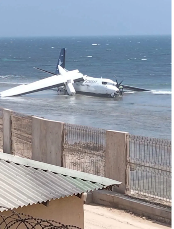 索马里民航局指出,机长在发现异常后立即通报并要求返航。飞机在尝试降落时偏离跑道,无法顺利停在停机坪,随后冲向机场周边的印度洋岸边浅水区并搁浅。现场画面显示,机翼断裂,机体停在海面上,但结构大致完整,乘客已自行或在协助下安全下机。