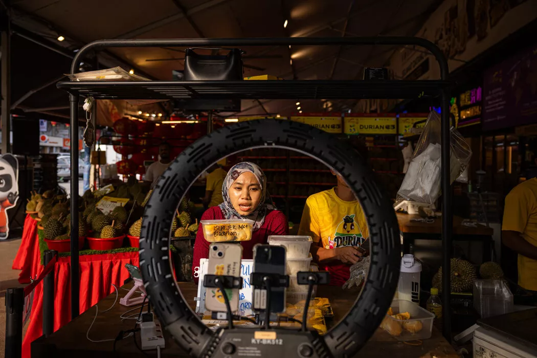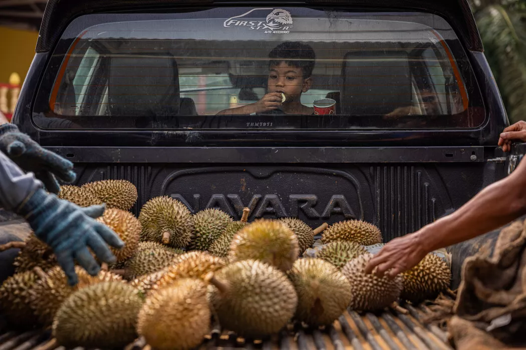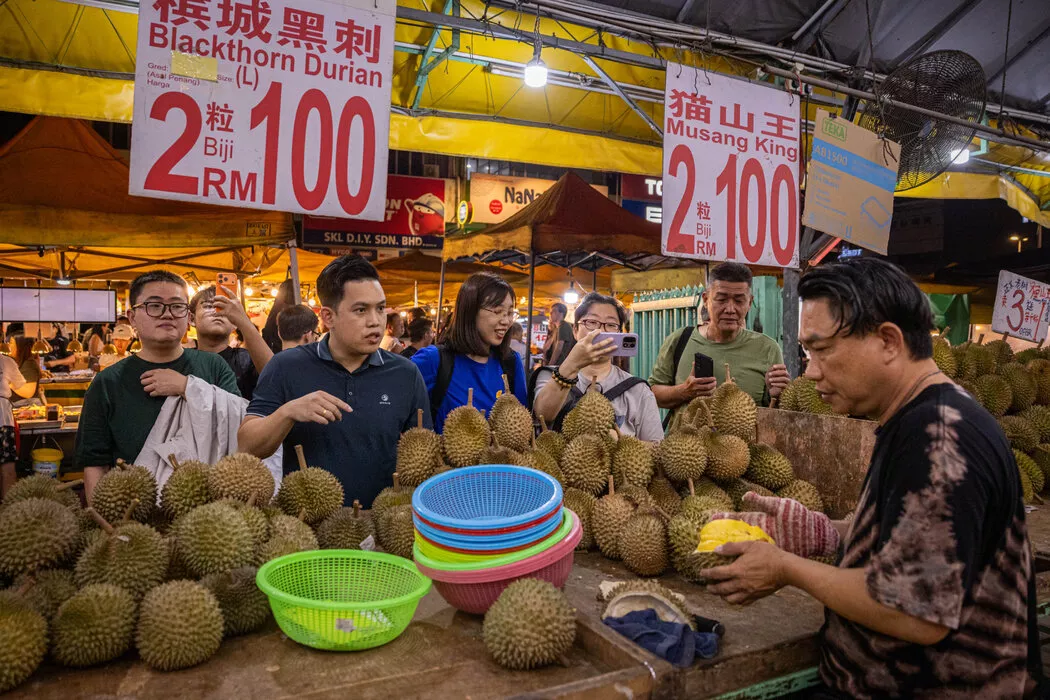 上个月在吉隆坡郊外的一处夜市,空气中弥漫着榴莲刺鼻的气味。街边几十家临时摊位的桌上堆着橄榄球大小的榴莲。顾客围站一旁,品尝着果肉厚实、质地如奶油般的榴莲。