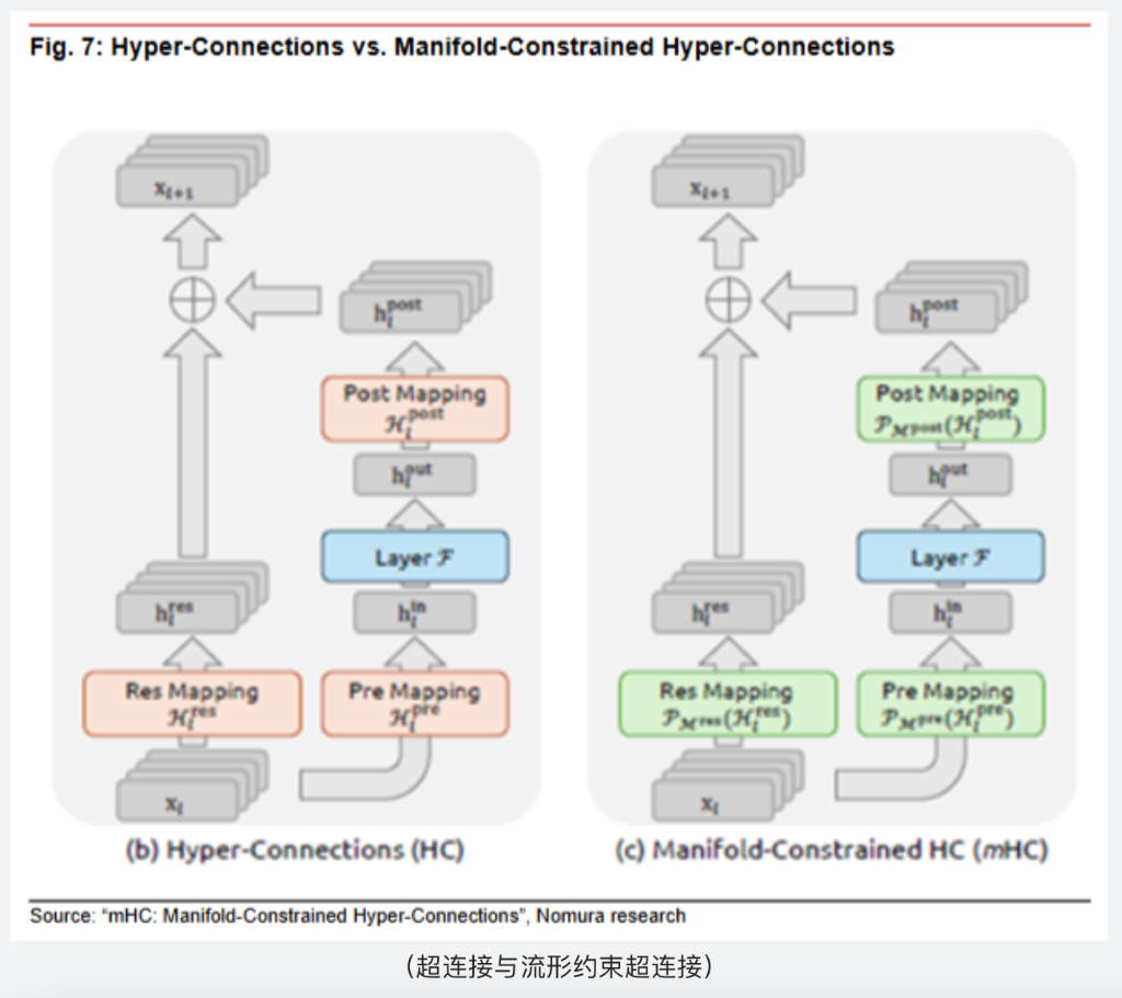 mHC:全称为“流形约束超连接”。它旨在解决Transformer模型在层数极深时,信息流动的瓶颈和训练不稳定的问题。