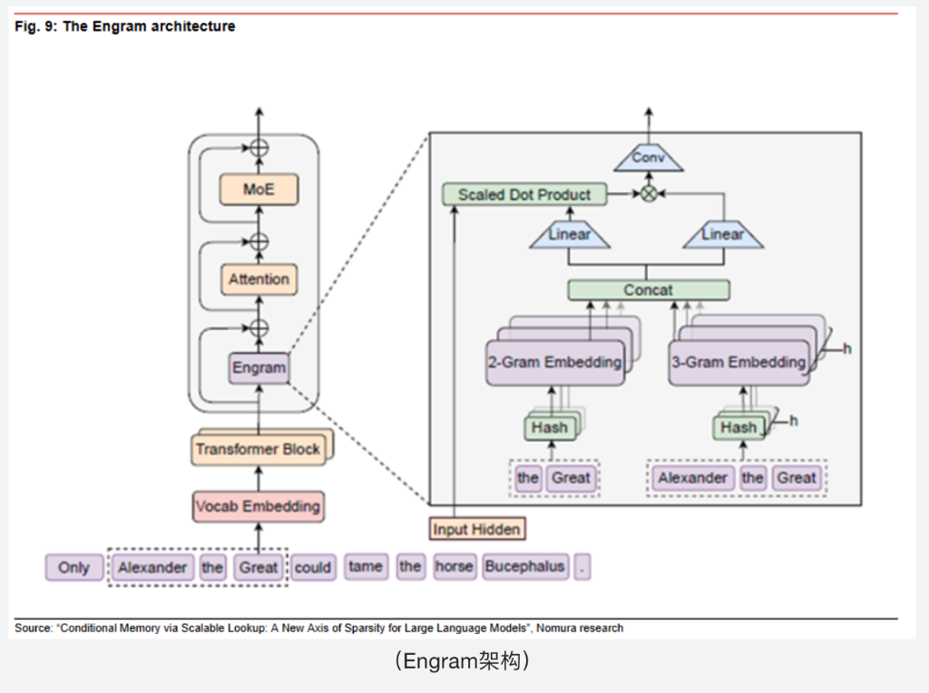 mHC技术通过改善训练稳定性和收敛效率,在一定程度对冲国产芯片在互联带宽与计算密度上的代际差距;而Engram架构则致力于重构内存调度机制,在HBM供应受限的背景下,以更高效的存取策略突破显存容量与带宽制约。野村认为,这两项创新共同构成一套面向国产硬件生态的适配方案,具有明确的工程落地价值。