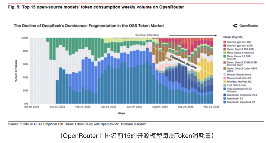 野村报告回顾了DeepSeek-V3/R1发布一年后的市场格局变化。在2024年底,DeepSeek的两个模型曾占据OpenRouter上开源模型Token使用量的一半以上。