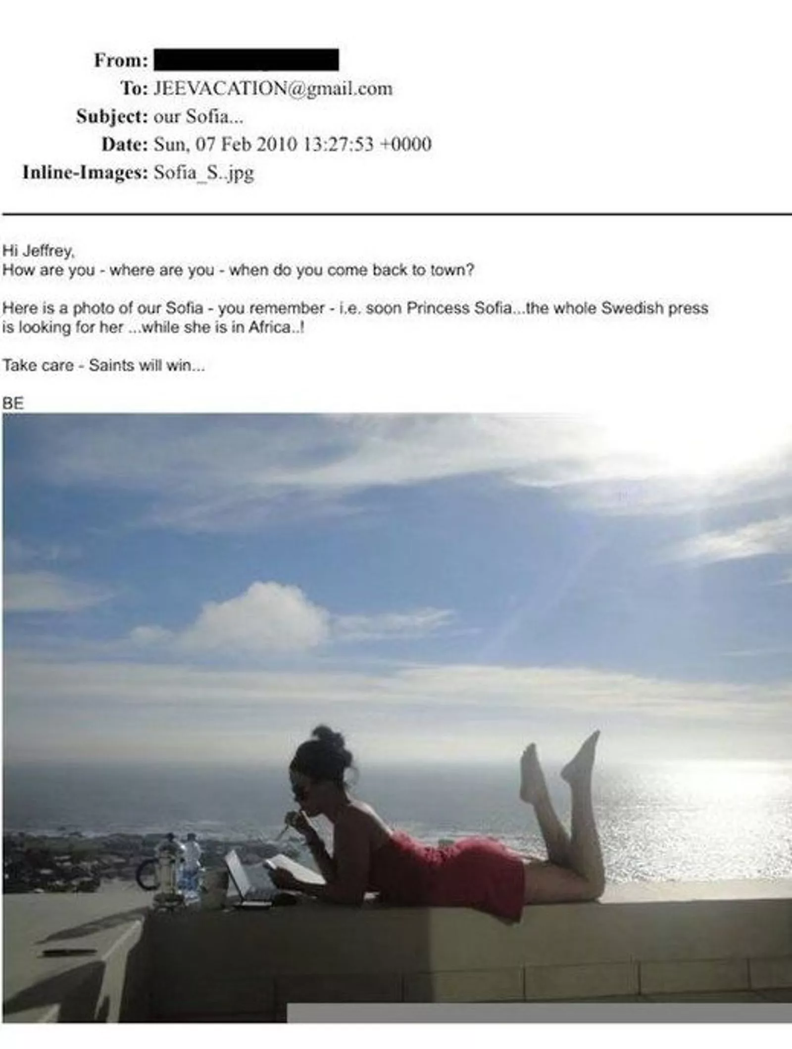 ▲ 有人将索菲亚过去在非洲的照片,寄送给艾普斯坦,内容问他是否还记得她?称她「很快会成为瑞典王妃」。