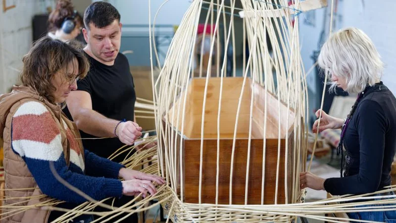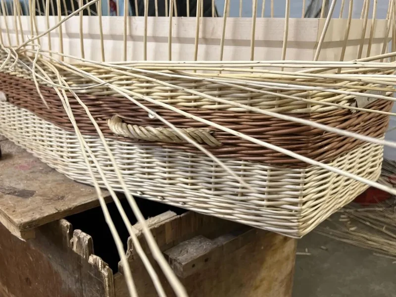 柳条需要预先在湿地中浸泡以增加柔韧性,然后工匠要像在绸缎上绣花一样,密密麻麻地将柳条缠绕在松木骨架上。每一道转折、每一个收口都要精确无误,才能确保整体的受力均匀且视觉平衡。