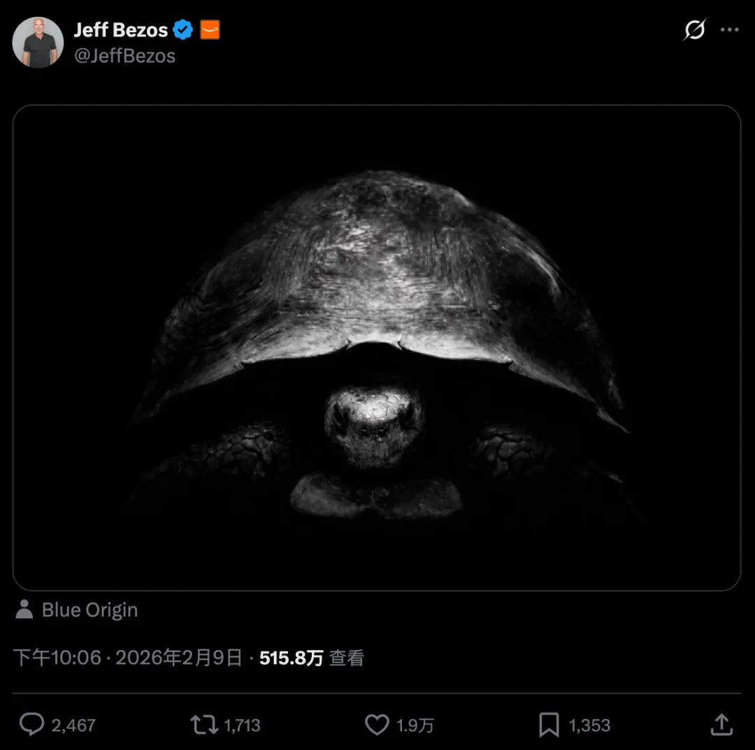 2月9日,美国超级碗开赛当晚,杰夫‧贝索斯(Jeff Bezos)在社交网站X上发了一张乌龟照片。