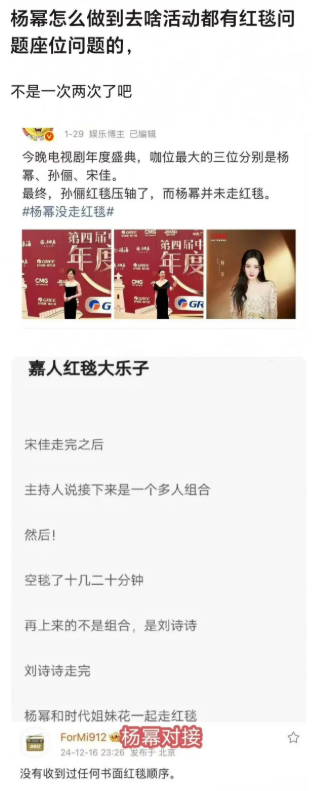 还有红毯顺序这件事,也不是杨幂第一次被吐槽了,每次有活动都要出点意外。