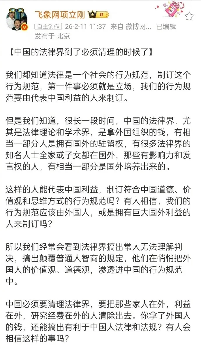上述帖子还指控:“中国的法律界,尤其是法律理论和学术界,是拿外国组织的钱,有相当一部分人是拥有国外的驻留权,有很多法律界的知名人士全家或子女都在国外,那些有影响力和发言权的人,有相当一部分是国外培养出来的。”他质疑这样的人不能代表中国利益。