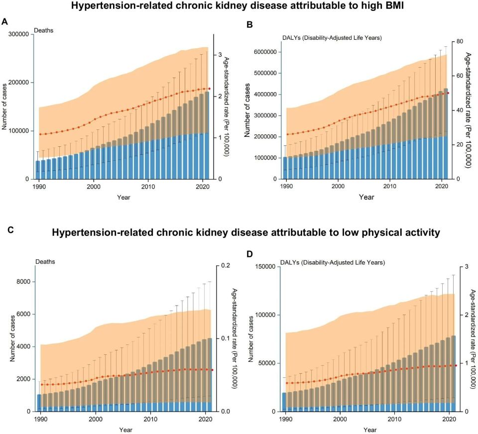 结果令人警醒:1990至2021年,全球因肥胖导致的HT-CKD死亡数暴涨392.9%,伤残调整生命年(DALYs,衡量疾病总体负担的核心指标)增长 322.2%;2021年一年就有179,788人因此丧生,相当于每天近500人离世,而身体活动不足也造成4479人死亡、7.79万DALYs 损失。