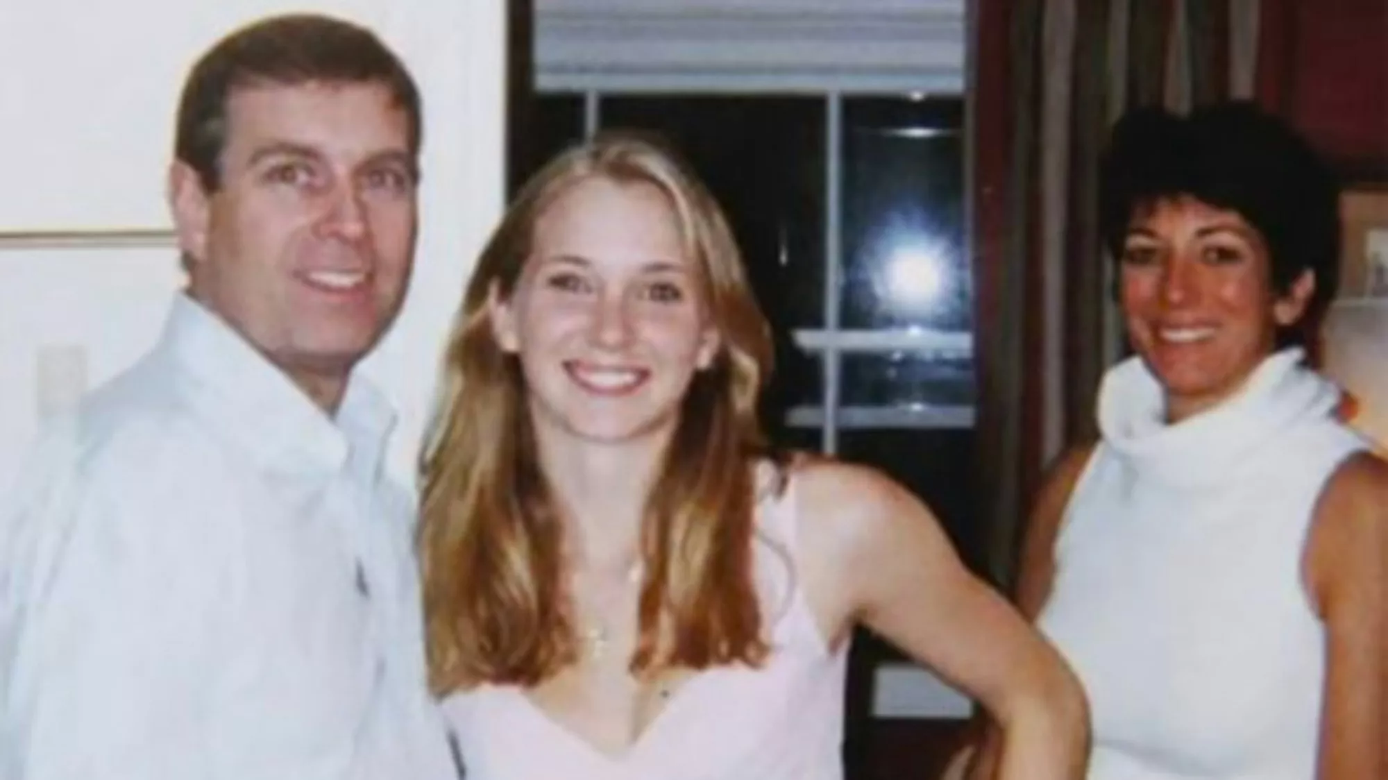 英国安德鲁(Andrew Mountbatten-Windsor,前称安德鲁王子)当年与性侵女子朱弗雷(Virginia Giuffre)的合照,而爱泼斯坦前女友马克斯韦尔(Ghislaine Maxwell右)则站在最右侧。(X@vicderbyshire)