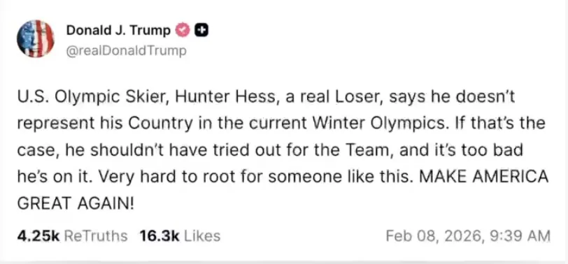 对此,美国总统特朗普于2月8日在其自创社交平台上对赫斯的言论予以猛烈抨击。