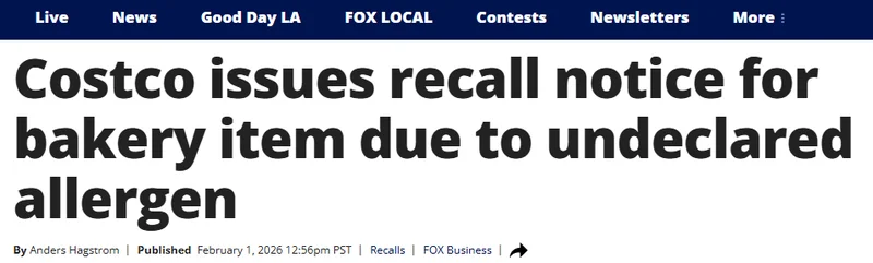 Costco近日发布召回通知,涉及部分因标签标注错误、可能引发顾客过敏反应的烘焙食品。