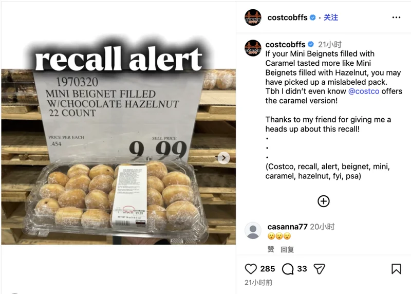 Costco表示,其一款“夹有焦糖馅的迷你面包圈(Mini Beignets filled with Caramel)”与另一款“夹有巧克力榛子馅的迷你面包圈(Mini Beignets filled with Chocolate Hazelnut)”被“意外”装入同一包装内。该公司指出,这些标签有误的产品含有“未标明的坚果”,可能对部分消费者构成健康风险。