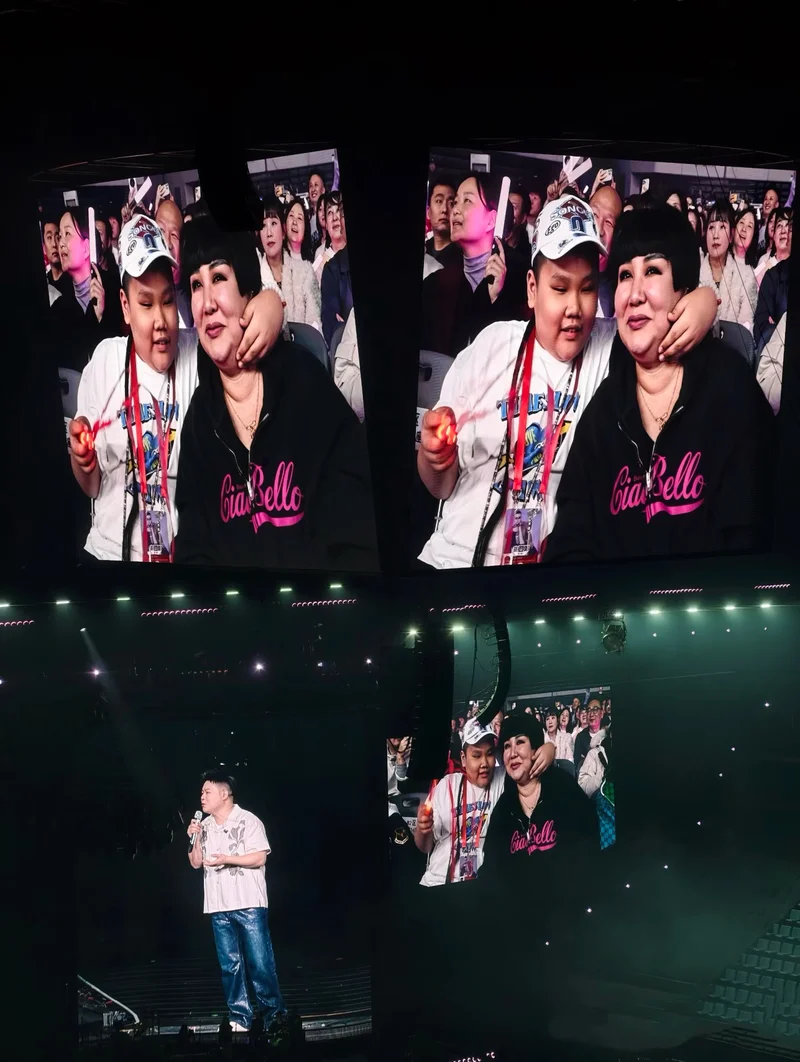 在岳云鹏演唱会上,王惠也带着儿子郭汾阳捧场。那时候王惠还是一头黑发,她穿着宽松的黑色T恤,休闲又大方,郭汾阳还亲了妈妈的脸。